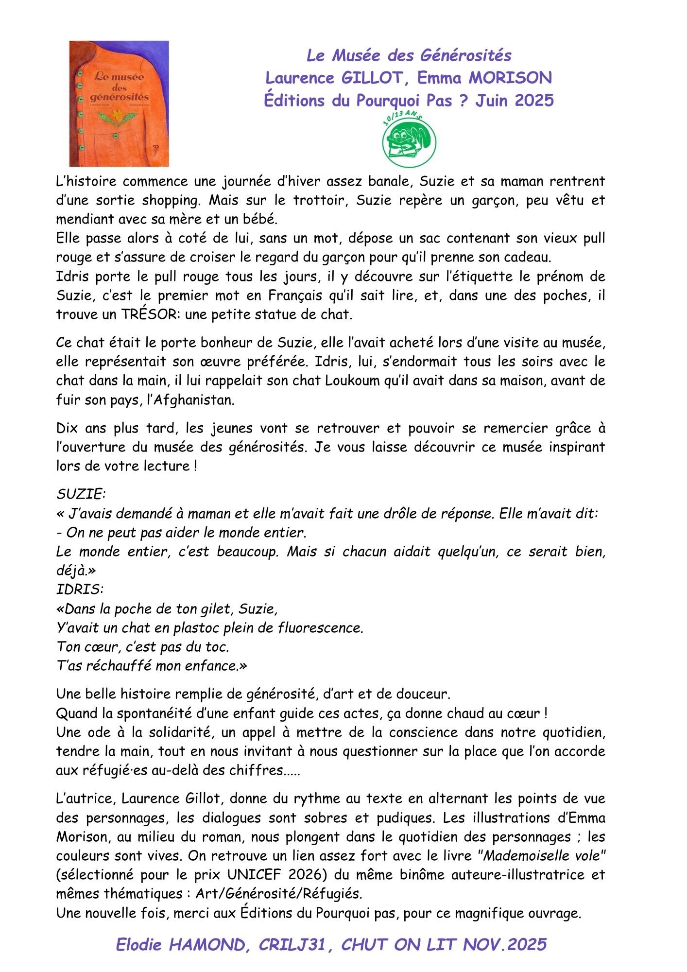 Ce contenu a été publié dans Coups de coeur, LIVRES a LIRE, avec comme mot(s)-clé(s) Chroniques, chut on lit, Le musée des générosités. Vous pouvez le mettre en favoris avec ce permalien.